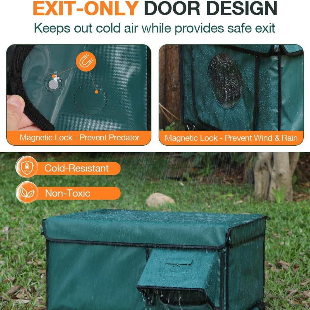 Rain, snow, hail, or humidity — this shelter is ready. Reinforced waterproof PVC walls, sealed seams, and an elevated base prevent moisture, mold, mites, and drafts. Built to resist strong winds, storms, and heavy weather — all while keeping them dry and cozy.